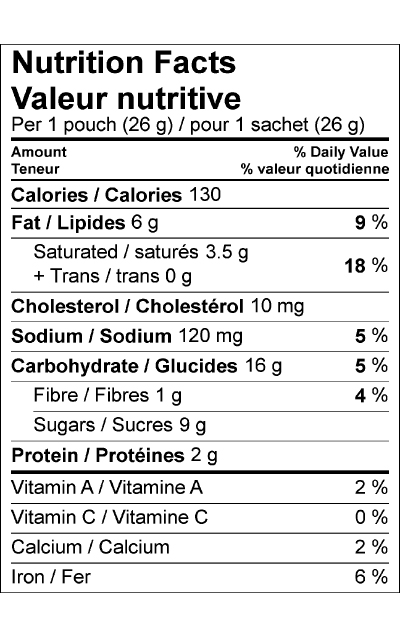 MILK CHOCOLATE (SUGAR, COCOA BUTTER, CHOCOLATE LIQUOR, MILK INGREDIENTS, SOYA LECITHIN, SALT, VANILLA EXTRACT), WHOLE ROLLED OAT, SUGAR, BUTTER, ENRICHED WHEAT FLOUR, RAISINS PASTE (RAISINS, SUNFLOWER OIL), FANCY MOLASSES, SODIUM BICARBONATE, SALT, SOYA LECITHIN, NATURAL FLAVOUR.