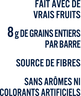 Le goût savoureux des framboises bien mélangé avec les bienfaits de l’avoine enfin en format familial! Une barre innovante et santé, faite avec de vrais fruits qui contient 8 g de grains entiers, et est une source de fibres. Elle est certifiée sans arachides et parfaite pour la boîte à lunch! Go Pure, Purement bon!