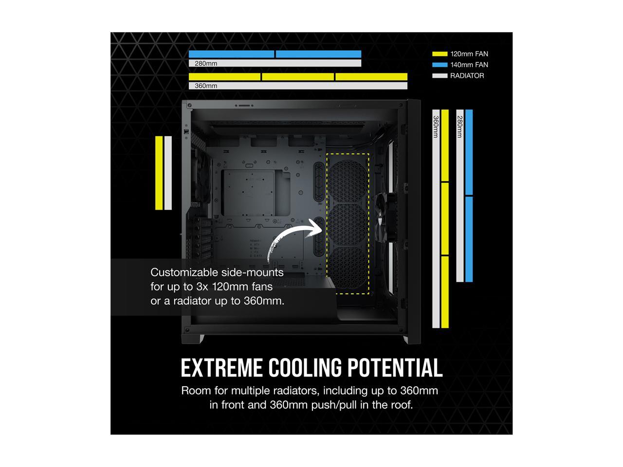| Features | Clean and Cool: The 5000D makes a stunning, showpiece-worthy PC easy to build, and even easier to keep cool with the space and flexibility to mount multiple 360mm radiators. High-Airflow Front Panel: An optimized steel front panel delivers massive airflow to your system for maximum cooling. CORSAIR RapidRoute Cable Management System: Makes it simple and fast to route your major cables through a single hidden channel, with an easy-access hinged door and a roomy 25mm of space behind the motherboard for all of your cables. Two Included 120mm Fans: CORSAIR AirGuide fans utilize anti-vortex vanes to concentrate airflow and enhance cooling. Motherboard Tray with Customizable Fan Mounts: Side-mount up to 3x 120mm fans or up to a 360mm radiator, enabling new flexible cooling options. Maximum Cooling Potential: A spacious interior fits up to 10x 120mm or 4x 140mm cooling fans, along with multiple radiators including up to a 360mm in front or side and a 360mm push/pull in the roof. Modern Front Panel I/O: Puts your connections within easy reach, including a USB 3.1 Type-C Port, 2x USB 3.0 port, and a combination audio/microphone jack. All the Storage You Need: Fits up to 4x 2.5in SSDs and 2x 3.5in HDDs. Tool-Free Tempered Glass Side Panel: Show off your high-profile components and RGB lighting. Removable Front and Roof Panels: For easy installation and cleaning of your components. |