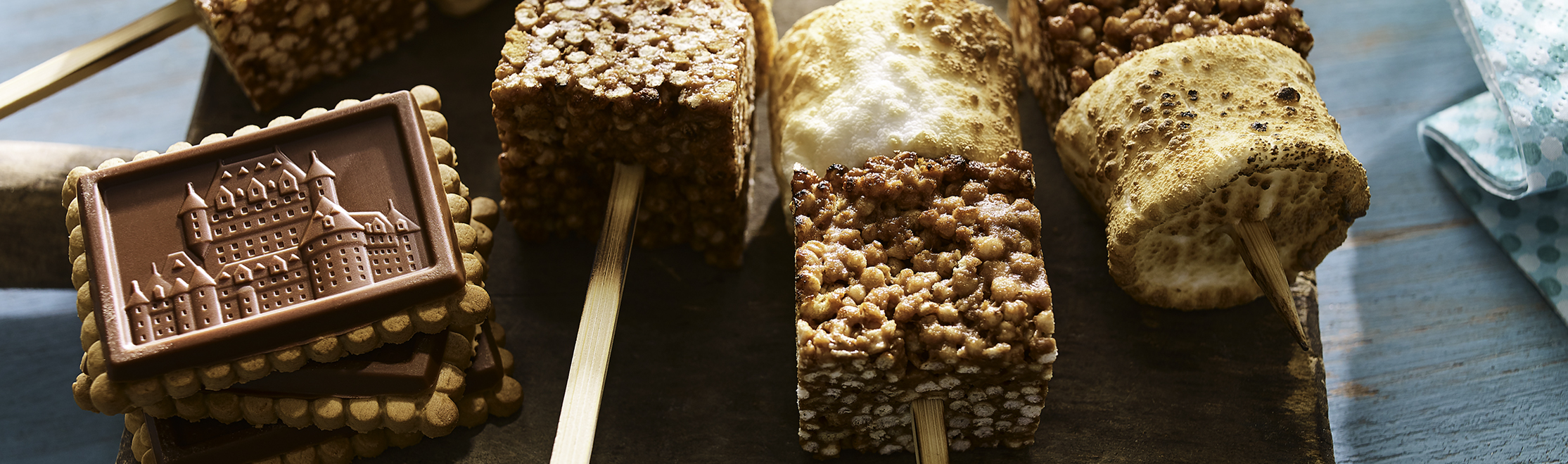 Remove from tin. Place on a work surface and cut into 16 cubes. Thread a cube and a marshmallow onto a skewer. Quickly brown marshmallow with a small kitchen torch.