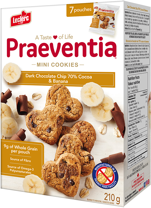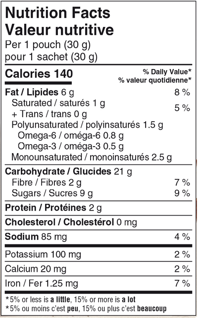 Mixed oat (whole rolled oats, whole oat flour), Brown sugar, Enriched wheat flour, Canola oil, Dark chocolate chips 70% cocoa (chocolate liquor, sugar, dextrose, cocoa powder, cocoa butter, soya lecithin, vanilla extract), Dehydrated cranberries (sugar, cranberries, sunflower oil), Cocoa powder, Milled chia seeds, Natural flavour, Sodium bicarbonate, Salt, Modified milk ingredients.