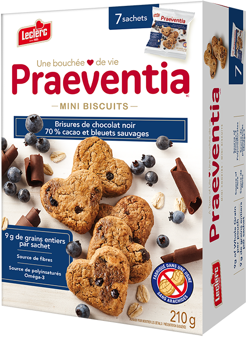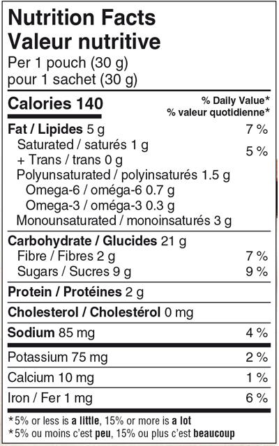 This delicious dark chocolate chip 70% cocoa and wild blueberry cookie contains 9 g of whole grain per pouch and is a source of fiber and Omega-3 polyunsaturates.