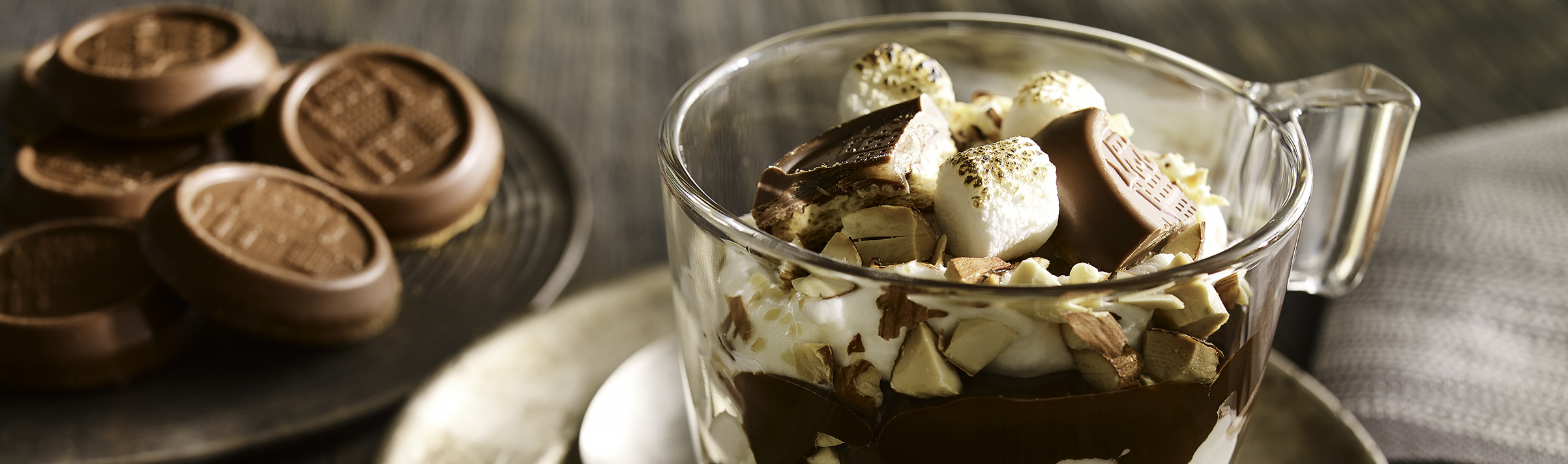 - Before serving, top each dessert cup with three marshmallows. Quickly brown marshmallows with a kitchen torch.