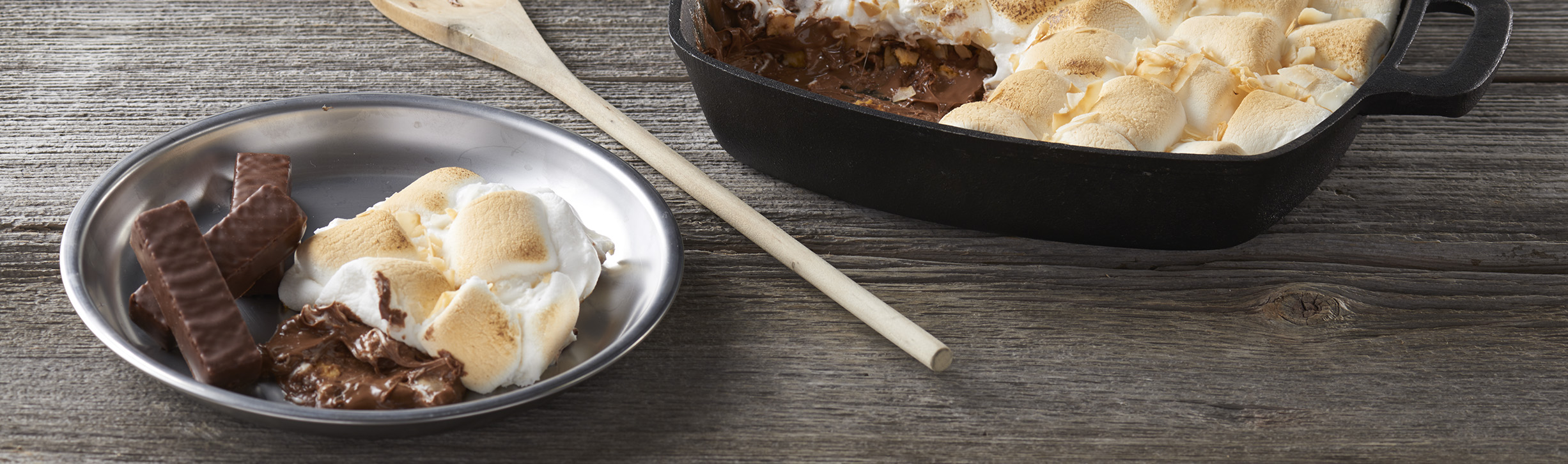 S’Mores dip can be baked in a 350F oven for 15 minutes.