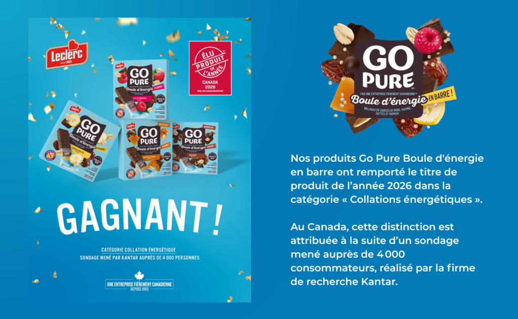 Nos produits Go Pure Boule d'énergie en barre ont remporté le titre de produit de l’année 2026 dans la catégorie « Collations énergétiques ». Au Canada, cette distinction est attribuée à la suite d’un sondage mené auprès de 4 000 consommateurs, réalisé par la firme de recherche Kantar.