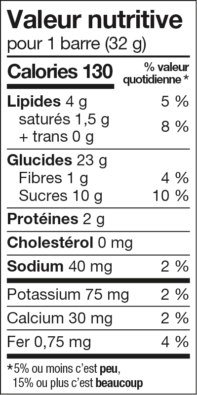 Granola (flocons d'avoine entière, sucre, huile de canola, mélasse qualité fantaisie, bicarbonate de sodium, lécithine de soya, extrait de romarin, acide ascorbique), Sucres (glucose, fructose, miel), Chocolat au lait (sucre, beurre de cacao, liqueur de chocolat, substances laitières, lécithine de soya, extrait de vanille), Flocons d'avoine entière, Mini bonbons au chocolat colorés (chocolat au lait [sucre, beurre de cacao, liqueur de chocolat, substances laitières, lécithine de soya, sel, arôme naturel], sucre, gomme arabique, sirop de maïs, cire de carnauba, gomme laque, cire d'abeilles, tartrazine, jaune soleil FCF, rouge allura, bleu brillant FCF, indigotine), Riz croustillant (farine de riz, sucre, carbonate de calcium, sel), Huile de canola, Glycérine, Arôme naturel, Lécithine de soya, Sel, Flocons de blé, Extrait de romarin, Acide ascorbique.