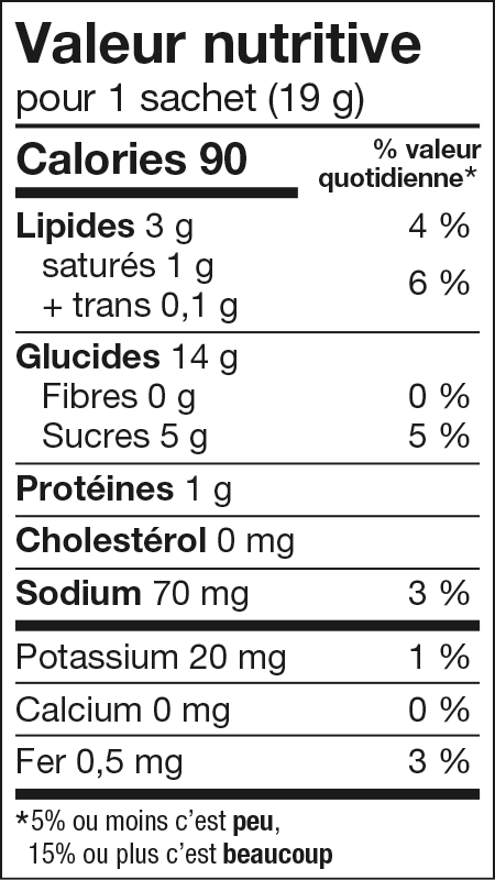 Farine de blé enrichie, Sucre, Huile de canola, Beurre (lait), Mono et diglycérides, Sel, Bicarbonate de sodium, Arôme naturel, Tocophérols, Lécithine de soya. Contient: Lait, Soya, Blé.