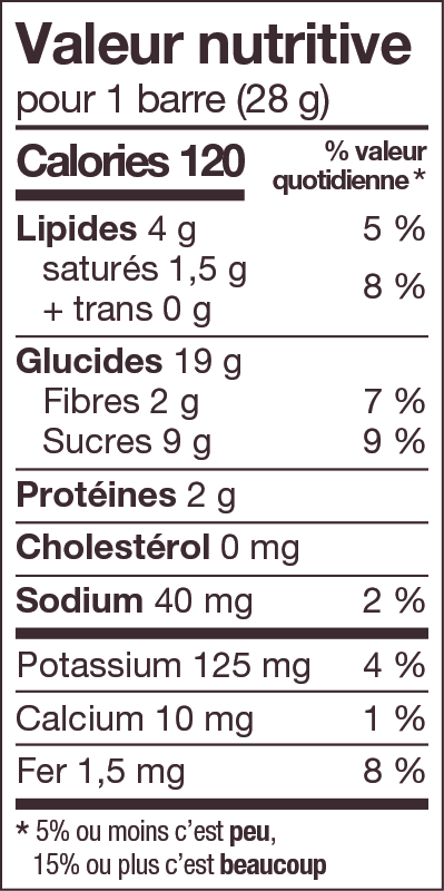 Sucres (pâte de dattes, sirop de maïs), Brisures de chocolat noir (sucre, liqueur de chocolat, beurre de cacao, lécithine de soya, sel, extrait de vanille), Flocons d'avoine entière, Quinoa croustillant, Huile de canola, Glycérine végétale, Bleuets sauvages déshydratés (bleuets, sucre, huile de tournesol), Poudre de cacao, Arôme naturel, Sel de mer, Lécithine de soya, Acide citrique, Flocons de blé, Poudre de lactosérum (contient du lait), Extrait de romarin, Acide ascorbique.