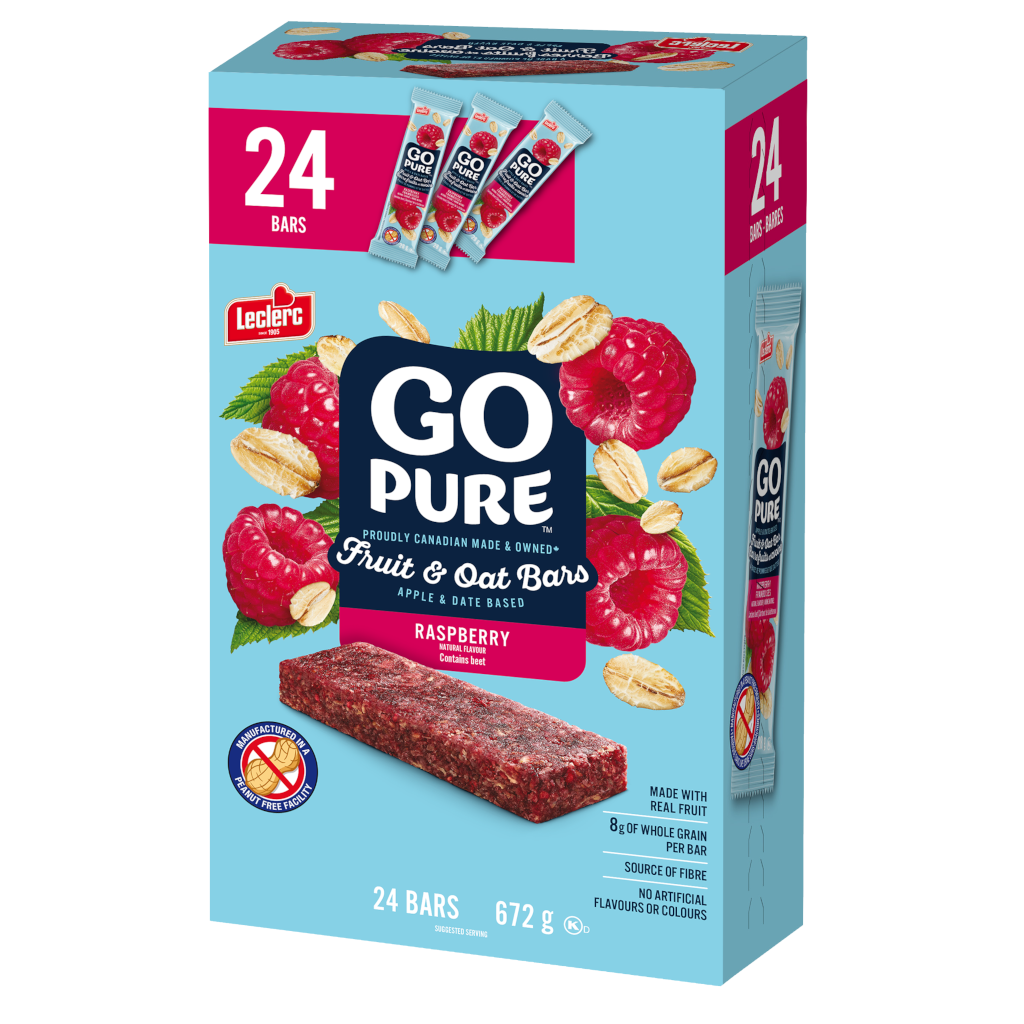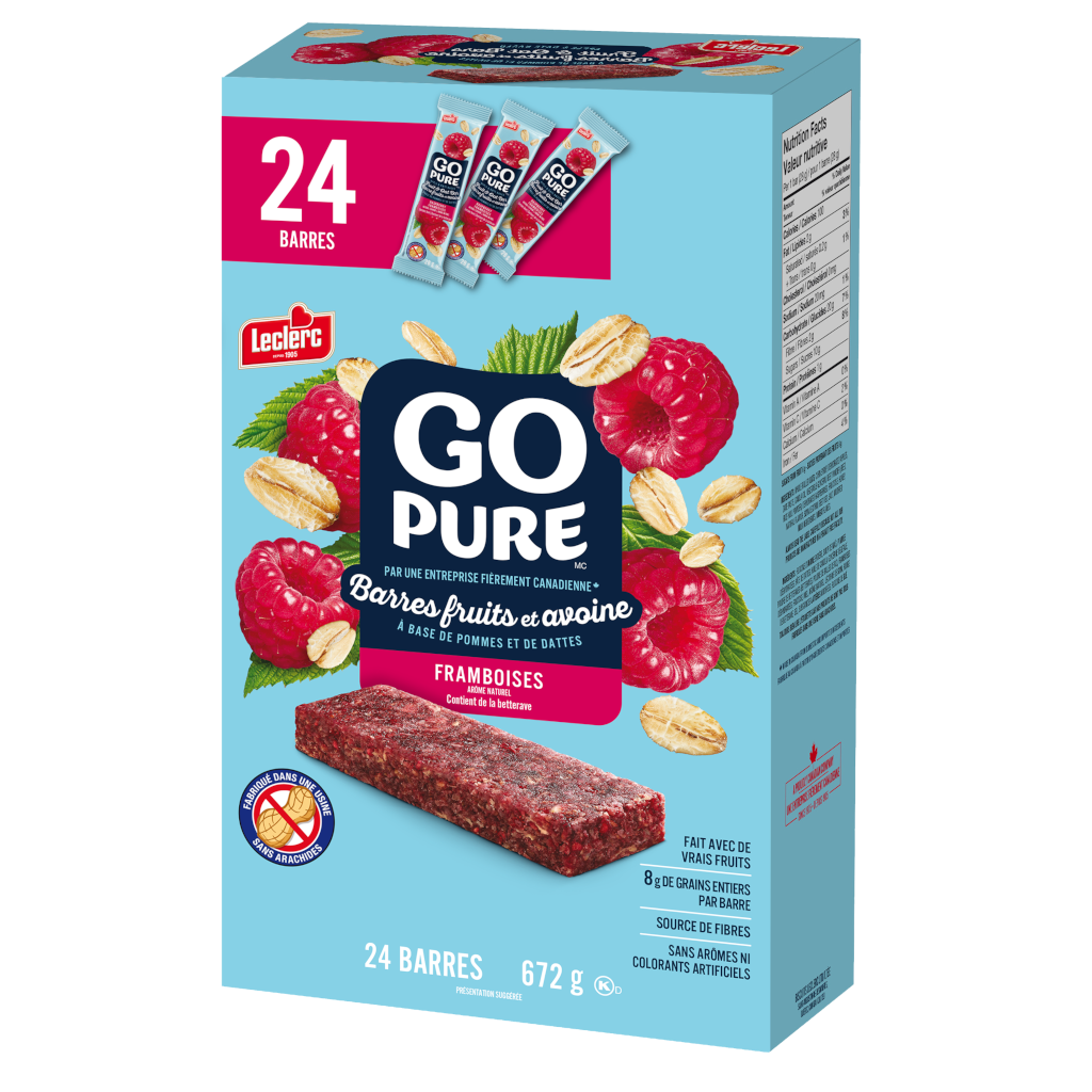 Le goût savoureux des framboises bien mélangé avec les bienfaits de l’avoine enfin en format familial! Une barre innovante et santé, faite avec de vrais fruits qui contient 8 g de grains entiers, et est une source de fibres. Elle est certifiée sans arachides et parfaite pour la boîte à lunch! Go Pure, Purement bon!